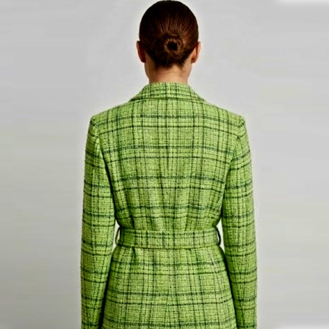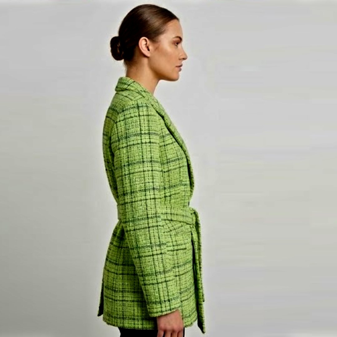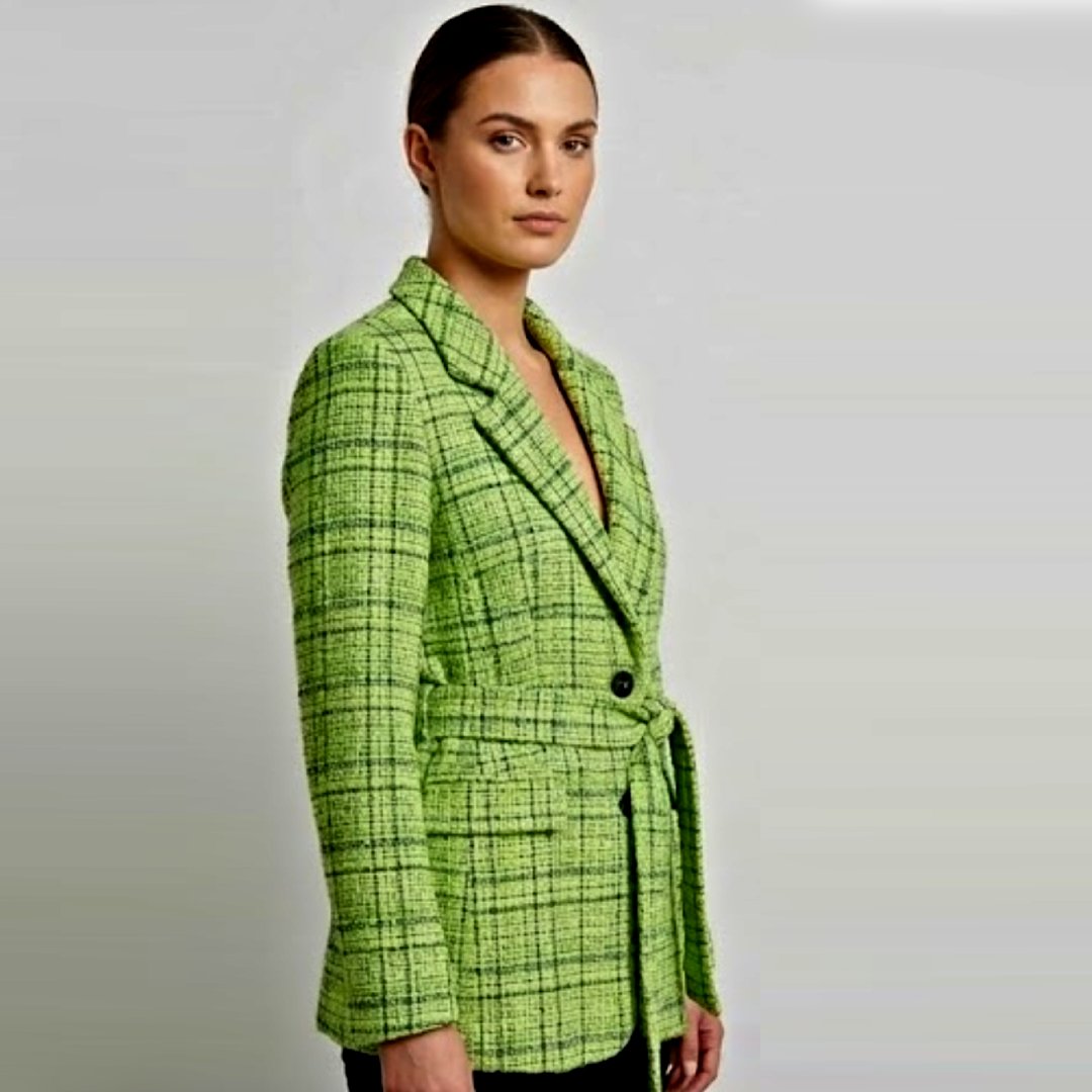 Woven from a premium lime-green checkered tweed, this jacket features a rich, tactile finish that adds depth and character to your wardrobe. The striking palette is grounded by subtle dark-green and black structural lines, creating a timeless “Check” pattern.
