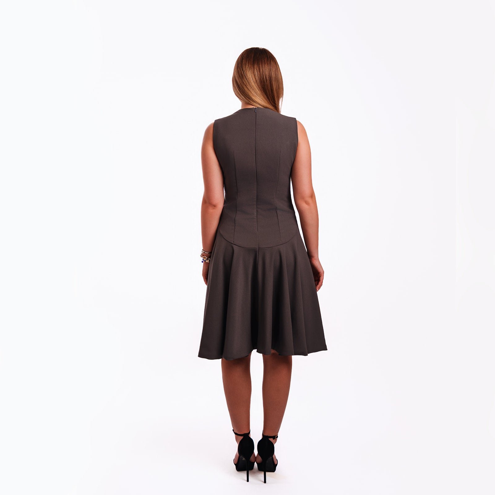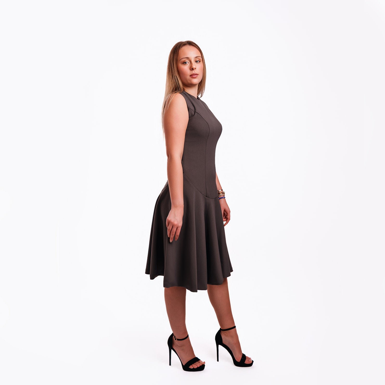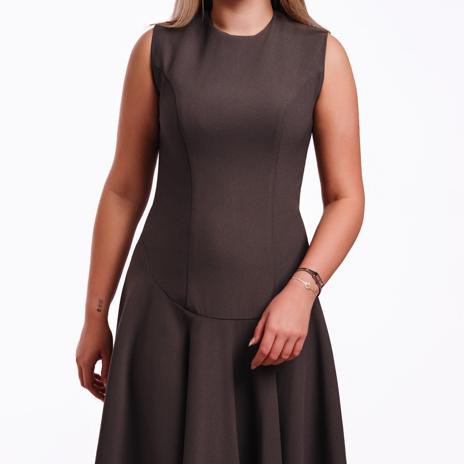 Beautifully tailored from a smooth mid-weight fabric, this sleeveless midi dress features a rich espresso-grey tone that enhances its minimalist elegance. The fitted bodice sculpts the waist before flowing into a soft flared skirt, creating graceful movement with every step. Thoughtfully constructed seam lines contour the body for a refined fit, while the clean round neckline keeps the look timeless and versatile. Designed for the modern woman, this dress transitions seamlessly from professional settings to elevated occasions.
