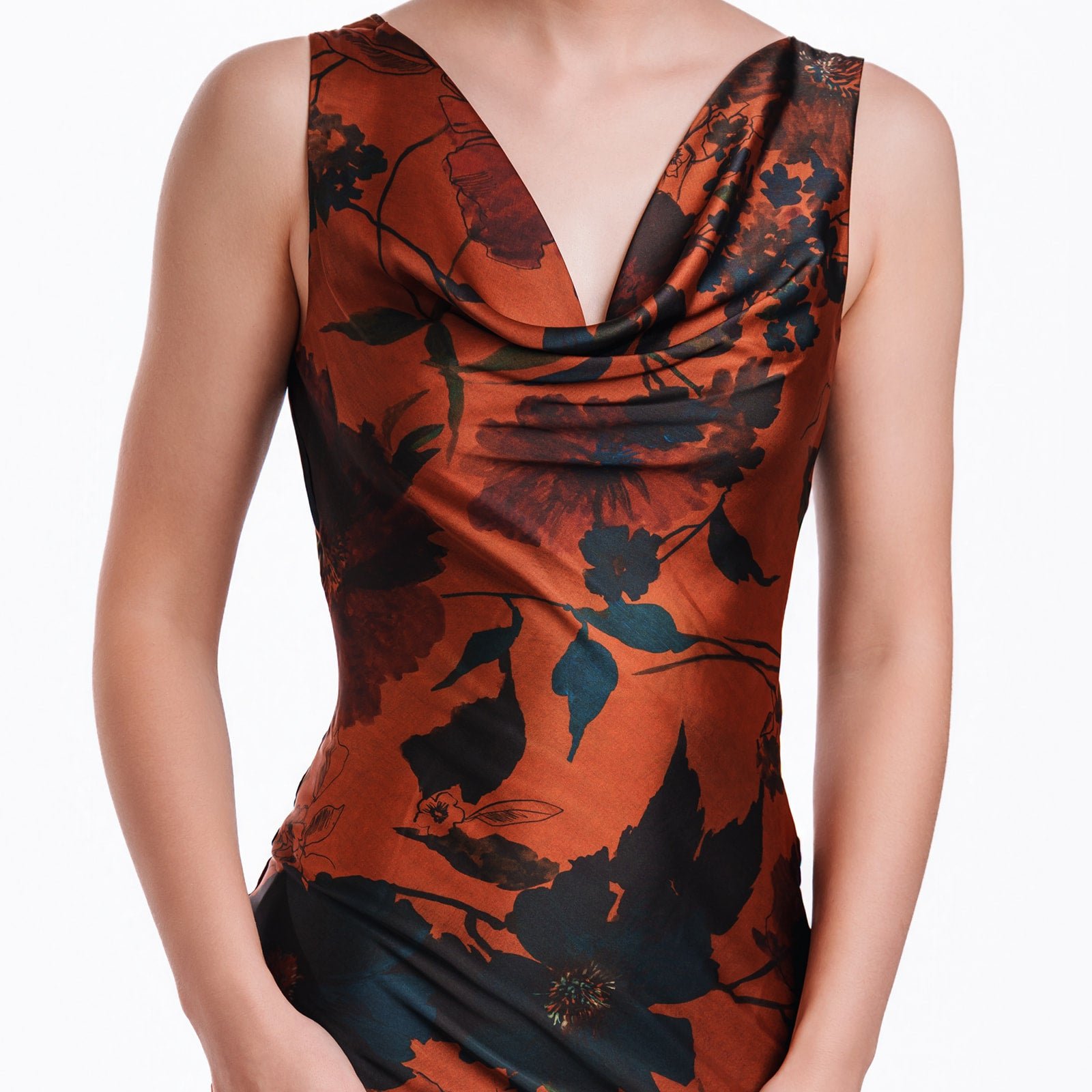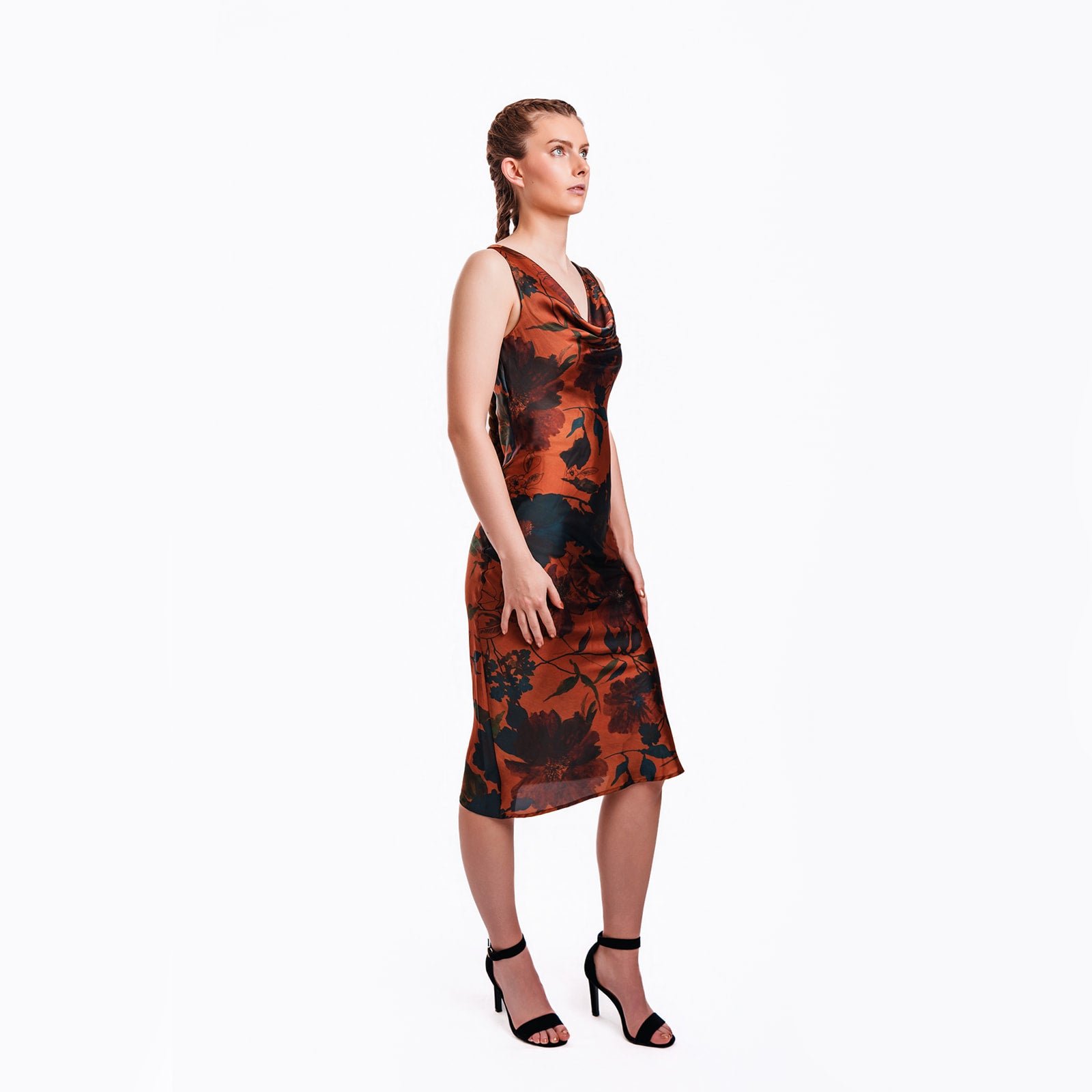 Crafted in a rich rust-toned fabric adorned with a bold floral print, this sleeveless midi dress features a softly draped neckline and a figure skimming silhouette. The elegant cut enhances the natural shape while maintaining a refined, wearable feel. Designed to hold its shape and drape beautifully, this piece offers both style and comfort in equal measure.