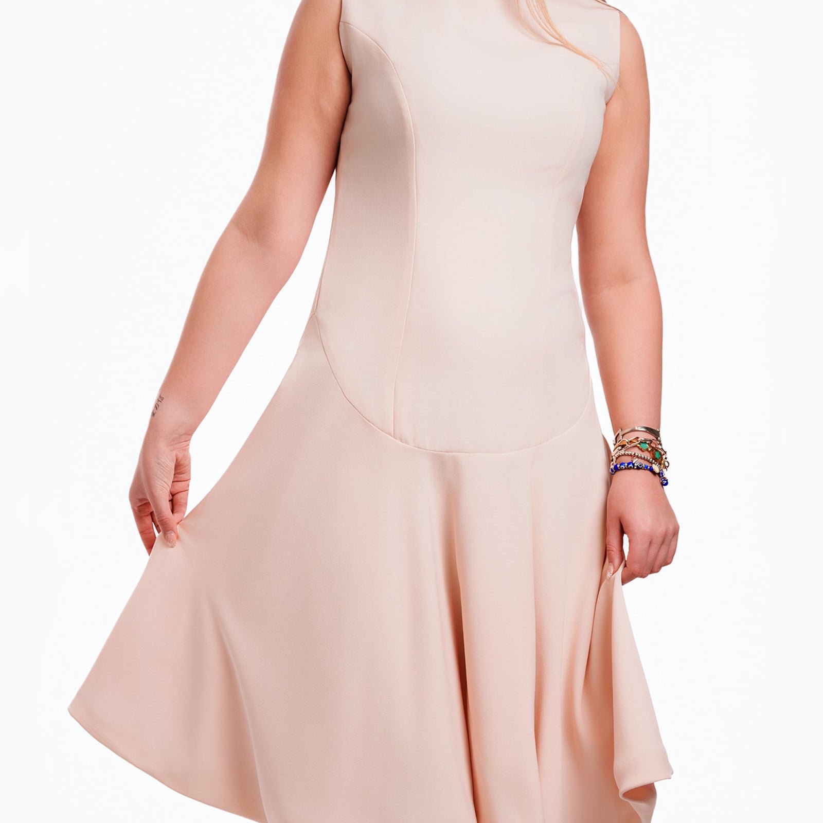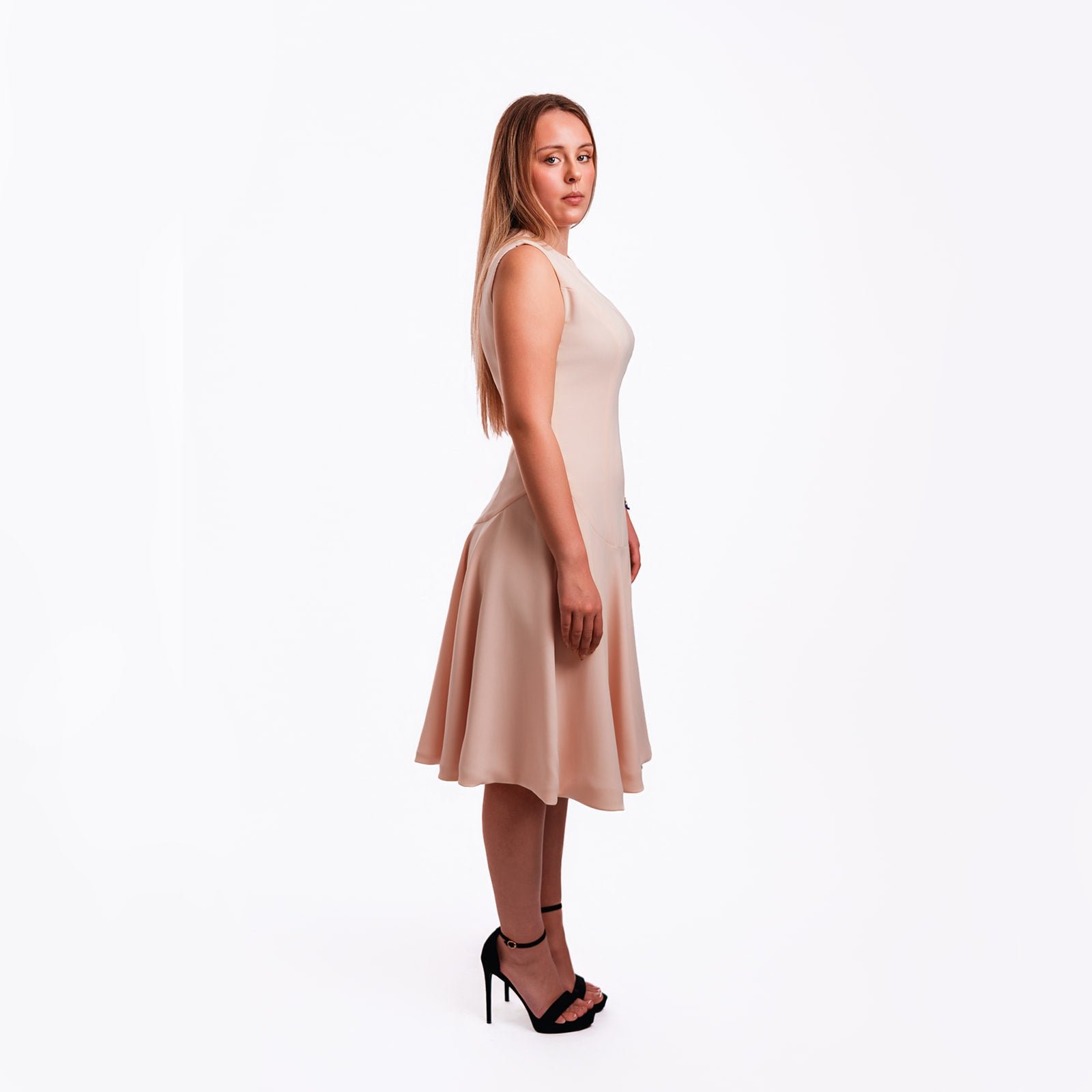 Crafted from a smooth, high-quality fabric with a subtle satin finish, this sleeveless midi dress drapes beautifully while maintaining a tailored shape. The structured bodice gently sculpts the figure before flowing into a soft A-line skirt, allowing for fluid movement and effortless elegance. Its minimalist design makes it an ideal foundation for statement accessories, tailored layers, or bold footwear.