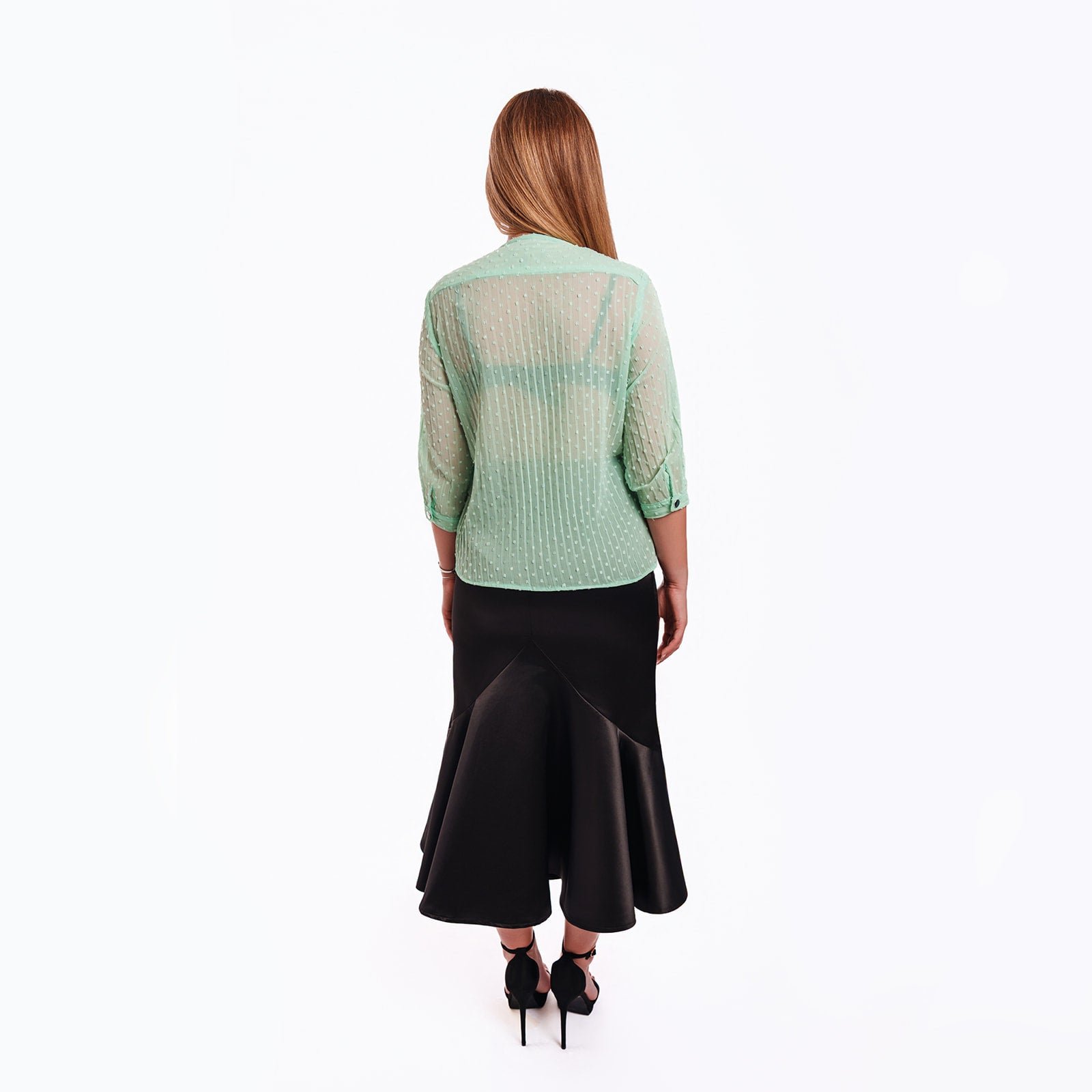 Featuring a delicate mint-green textured chiffon blouse paired with a sculpted black flared skirt, this Karen Gold look balances softness with modern tailoring. The lightweight semi-sheer blouse adds a refined, feminine dimension, while the structured skirt creates a flattering silhouette that moves beautifully with every step. Together, they form a polished yet contemporary outfit suitable for both daytime sophistication and evening elegance.