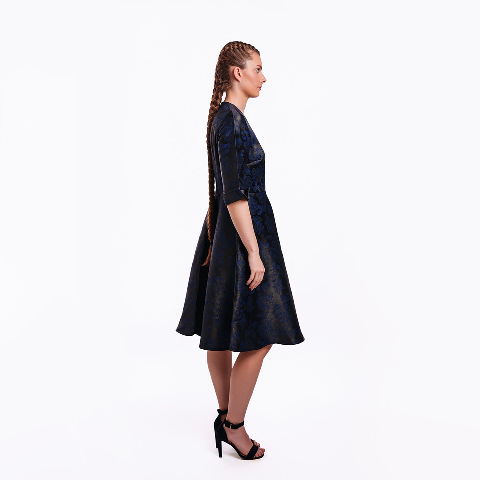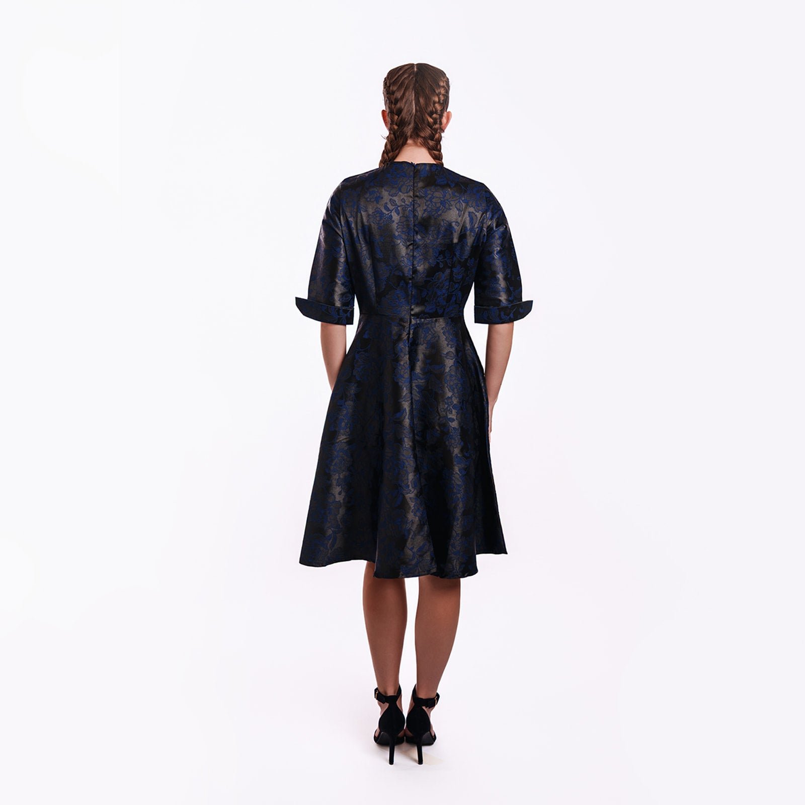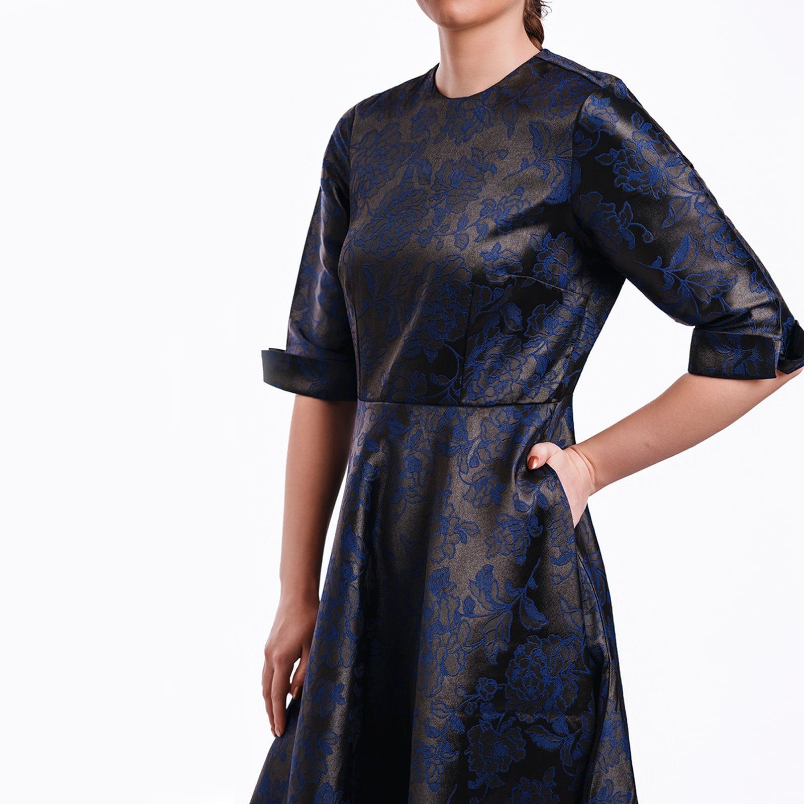 Timeless Elegance in Luxurious Jacquard. A sophisticated fit-and-flare silhouette crafted in sumptuous navy jacquard, this dress embodies refined femininity with a contemporary edge. The intricate floral brocade catches the light beautifully, revealing subtle hints of midnight blue and charcoal throughout the lustrous fabric.