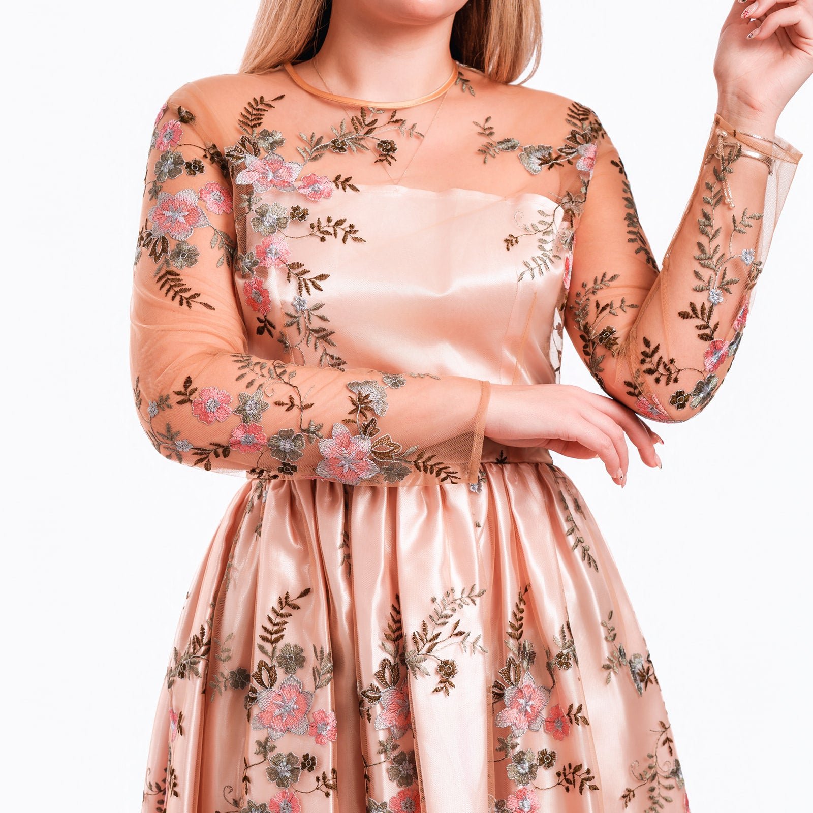 Crafted in a soft satin base with a delicate sheer embroidered overlay, this dress blends structure with ethereal femininity. The intricate floral embroidery in subtle tones of blush, sage, and muted rose creates a romantic and refined visual texture. Fully lined for comfort and coverage, this piece offers a graceful balance between elegance, artistry, and wearability.
