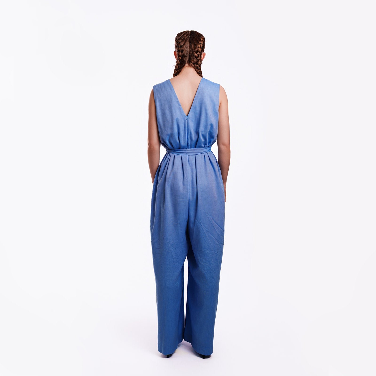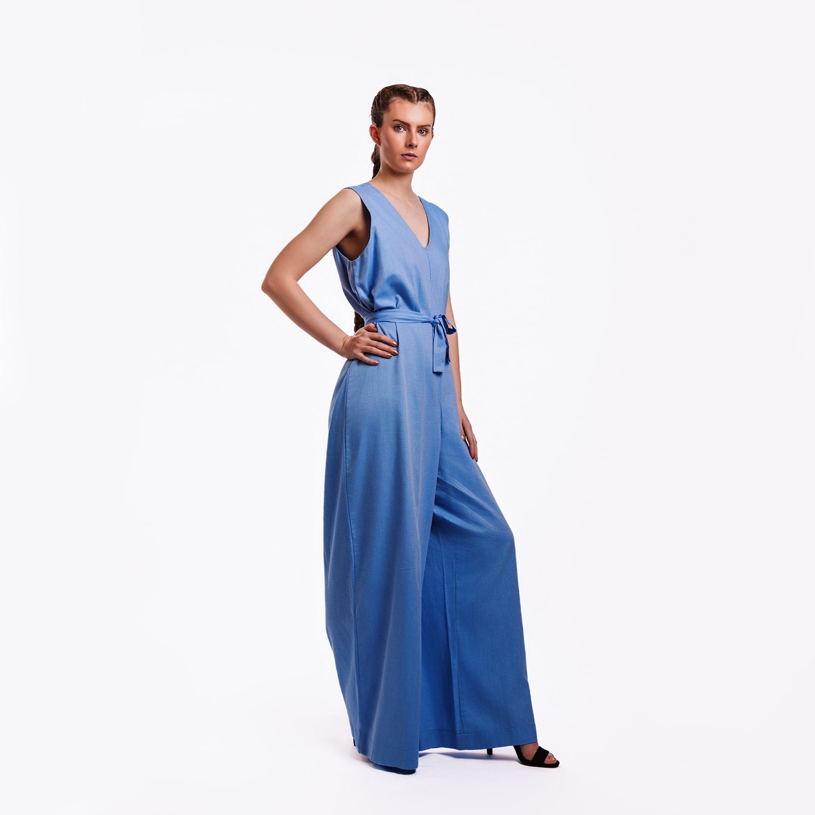 This sleeveless jumpsuit features a flattering wide-leg cut and a softly structured bodice, designed to elongate the frame while offering all-day comfort. Finished with a self-tie waist belt, it allows for adjustable styling and a personalised fit, creating a polished yet relaxed silhouette.